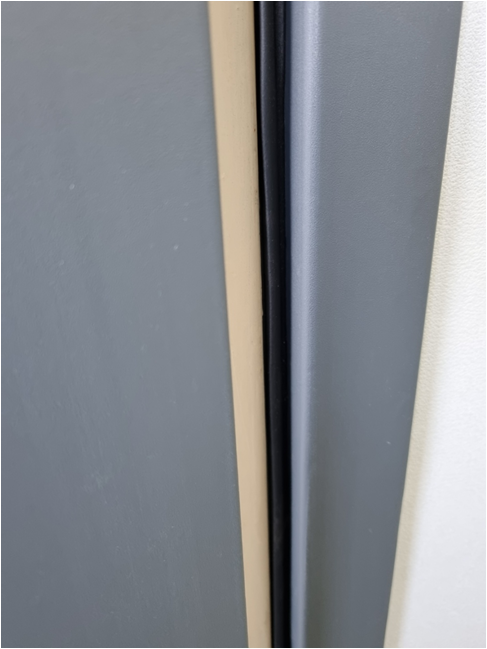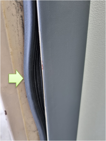 옆에서 보더라도 고무가 튀어나온 부분이 안 보인다. 살짝 튀어나왔을 때 문이 닫히면 철문의 틈 사이를 막아줄 텐데, 지금은 바람을 막아주지 못해서 외부 먼지, 바람이 계속 들어오는 상황. 교체가 필요합니다.