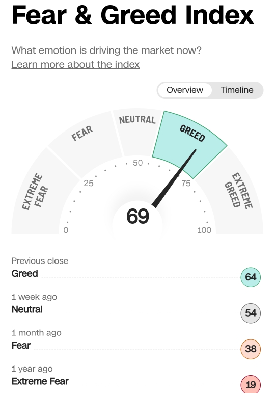 공포와 탐욕지수도 69, 나스닥 100의 RSI도 80 이상입니다.