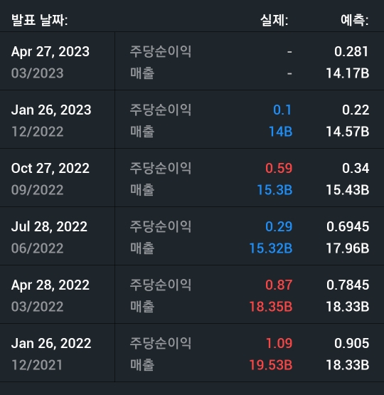 주당순이익이 기대치 0.22 실제 0.1로 기대치보다 절반 이하 수준.