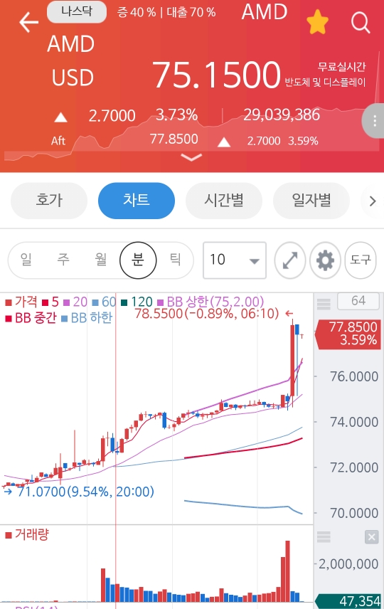 AMD는 +3.73%로 상승해서 장을 마감했다가, 실적 발표 후 시간 외에서 +3% 정도로 상승 중입니다.
