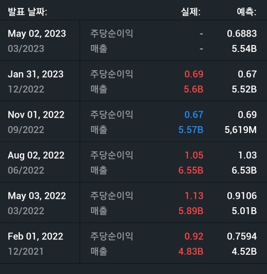 2023년 1분기의 주당순이익 기대치는 0.688으로2022년 4분기정도의 순이익으로 기대하고 있습니다.
