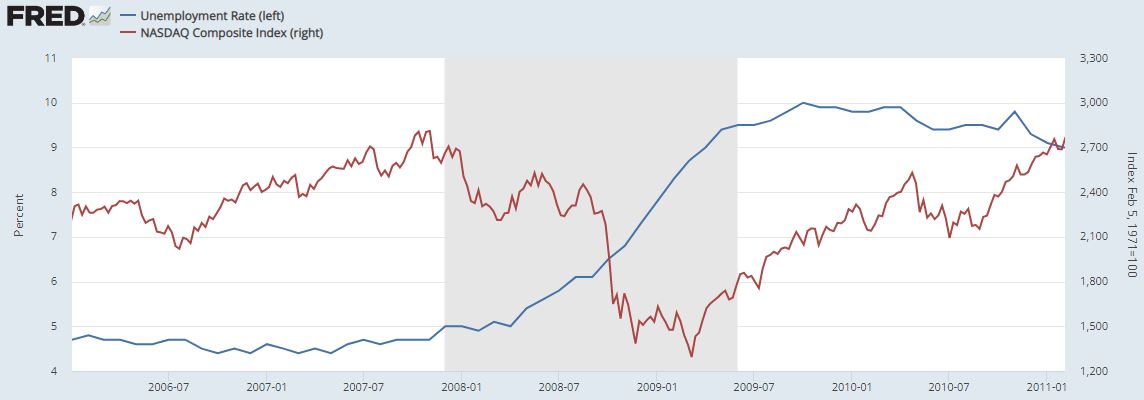 2. 2008년 리먼브라더스 사태로 실업률이 증가할때 나스닥의 급락이 동반되었습니다. (주가 움직임이 선행되었습니다.)