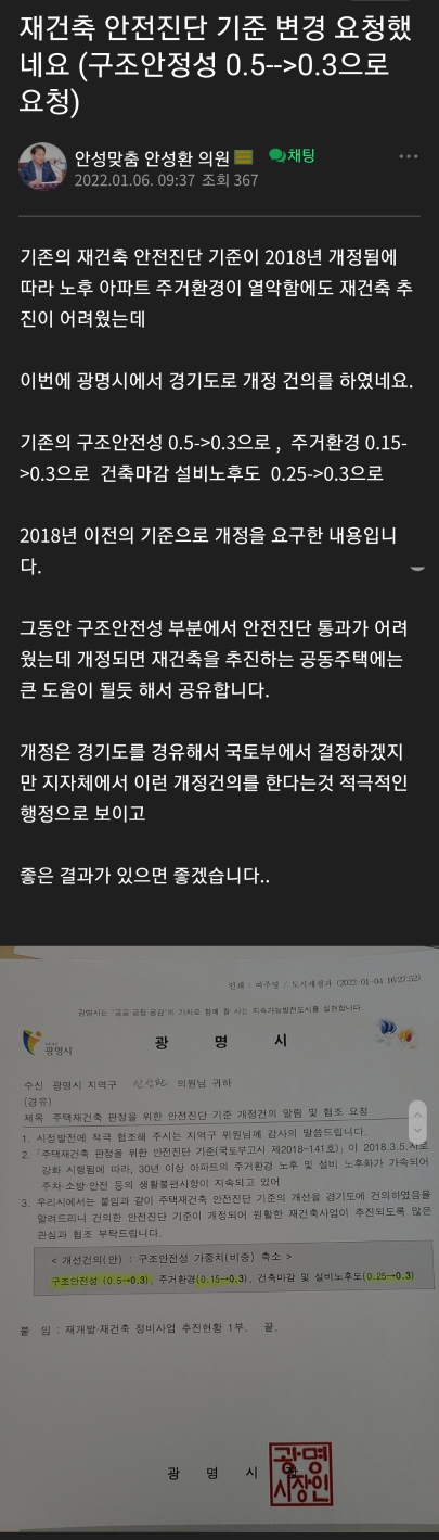이번에 광명시에서 경기도에 안전진단 기준을 완화하는 방향으로 개선건의 했다고 합니다.