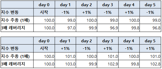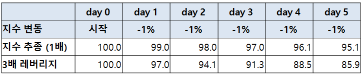 위 표에서 지수 추종은 -1%로 단순 x 3배를 하면 -3%여야 하지만, 실제 3배 레버리지는 -3.2% 하락했고,