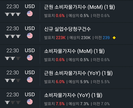 1월 CPI 지수가 7.5%로 나타나면서 예상치를 상회한 결과가 발표 됐고 미국 장전 거래에서 하락 중입니다.