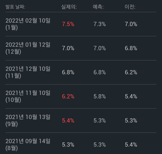 인터넷에는 CPI 지수가 몇년만에 최대치다 인플레이션 공포다 이런 기사들이 나올겁니다. 하지만 히스토리와 예측치를 보시면 12월에도 높았고 1월에도 높아질 것으로 예상했는데 예상치보다 조금 더 높은 정도입니다. 12월 보다 낮아질 것으로 예상했는데 상승했다면 정말 쇼크한 수치인데 그 상황은 아닙니다.