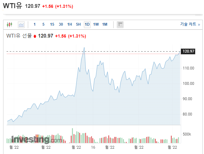 WTI유, 브렌트유 선물이 모두 배럴당 120$가 넘는 상황입니다.
