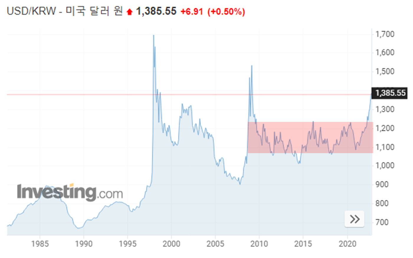 요즘 환율이 심상치 않습니다. 2010년 이후부터 달러당 1100원~1200선에서 움직이던 달러 환율이 1400원을 향해서 달려가고 있습니다.
